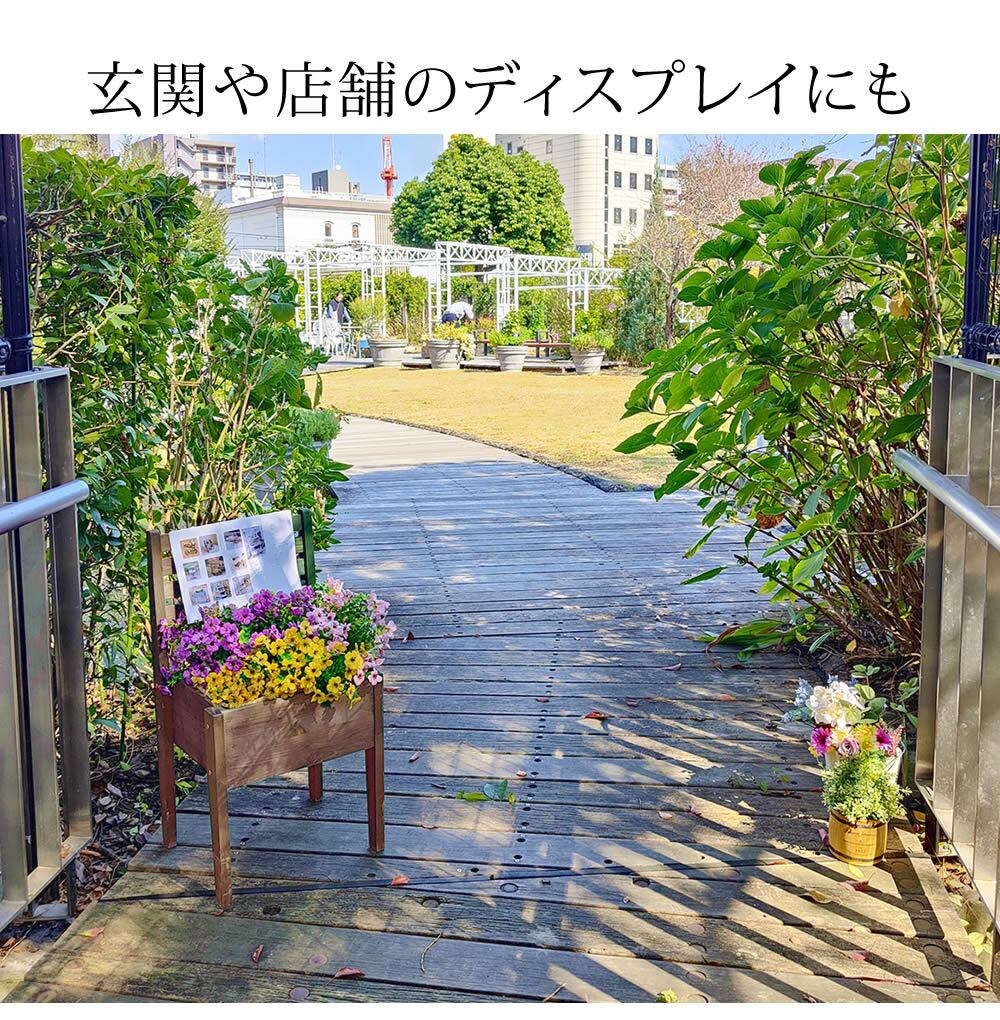 ありそうでなかった、寄せ植えが映える椅子型プランタースタンドです。玄関脇やベランダ、ポーチのような土のない場所を、生き生きとした華やかな空間に変えます。天然木の温かな手触りと、フランスの田舎町にありそうなアースカラーも自慢