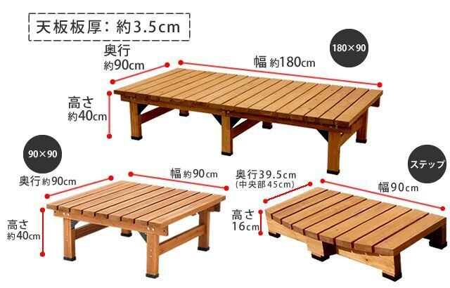 住まいスタイル デッキ縁台180×90 3点セット【送料無料 ウッドデッキ風 簡単 縁側 本格的 DIY 木製 天然木 庭 ベランダ マンション おしゃれ 小型 北欧 ガーデン 屋外 家具 ライトブラウン ダークブラウン】