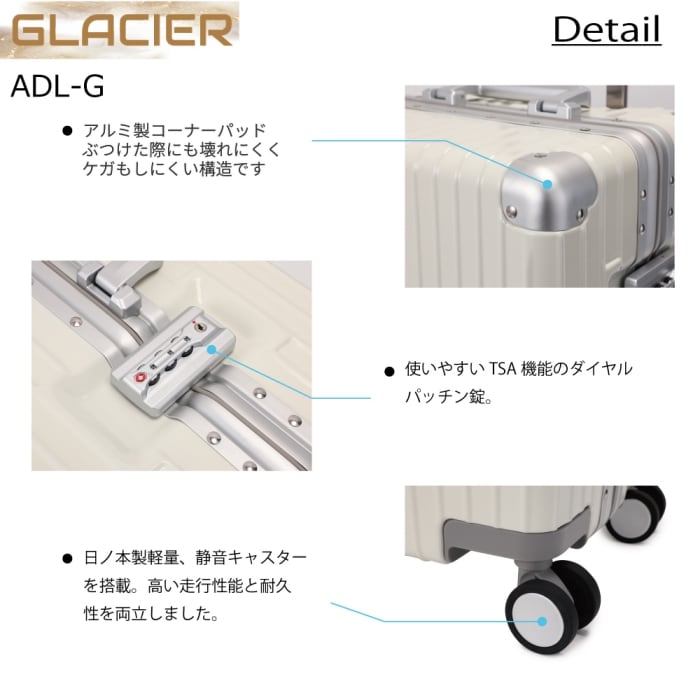 24インチ Glacier キャリーケース スーツケース 機内持ち込み 静音キャスター TSAダイヤル式 丈夫 頑丈 33L〜90L シルバー ブラック クリーム 3サイズ 50cm 58cm 68cm ADL-G