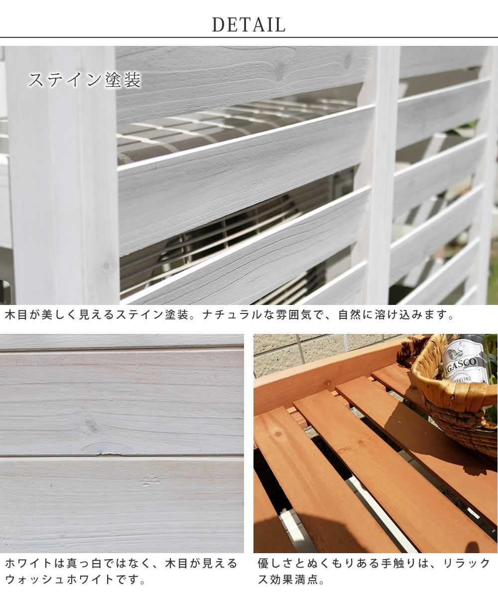 ※北海道・沖縄・離島は別途送料が必要となります。ナチュラルスタイルのお庭づくりに。どうしても生活感がにじみ出てしまうエアコン室外機は、おしゃれな室外機カバーで、目隠ししてしまいましょう。天然素材の室外機カバーなら、センスのいいお庭にイメージチェンジできるだけでなく、上にプランターやガーデニング用品が置けるので、デッドスペースだった空間を有効活用できます。広めの板幅で熱がこもりにくいだけでなく、板を上向きにすることで、周囲のグリーンに熱風が当たらないよう工夫しました。直射日光が当たる位置に室外機があるなら、室外機カバーで日陰を作ることで、節電効果も期待できます。