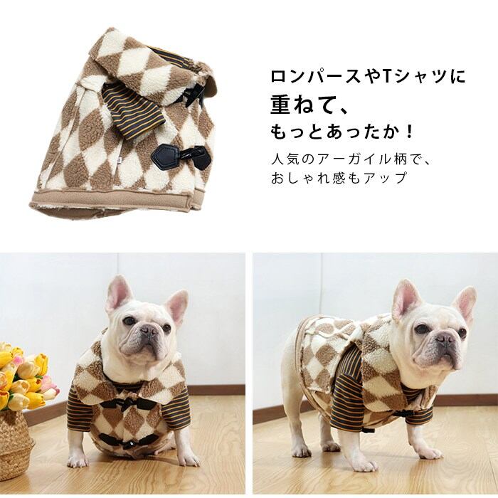 犬 ベスト 冬 重ね着 服 ボア 防寒 フリース 冬 もこもこ ウェア おしゃれ 重ね着 コーデ フレブル フレンチブルドッグ 冬服 パグ 暖かい アーガイル 柄 ふわもこ 屋外 室内 兼用 ルームウェア