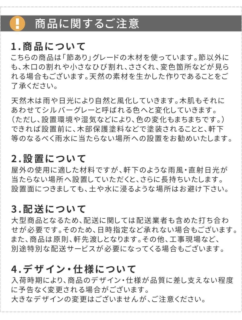 ※天然木は雨や日光により自然と風化していきます。木肌もそれにあわせてシルバーグレーと呼ばれる色へと変化していきます。(ただし、設置環境や湿気などにより、色の変化もまちまちです。)