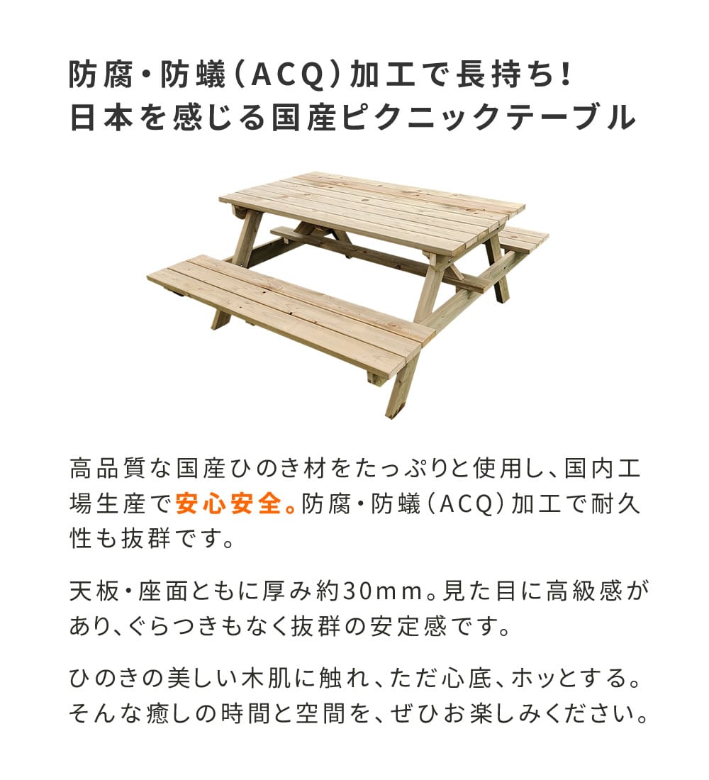 ●防腐・防蟻(ACQ)加工で長持ち!日本を感じる国産ピクニックテーブル