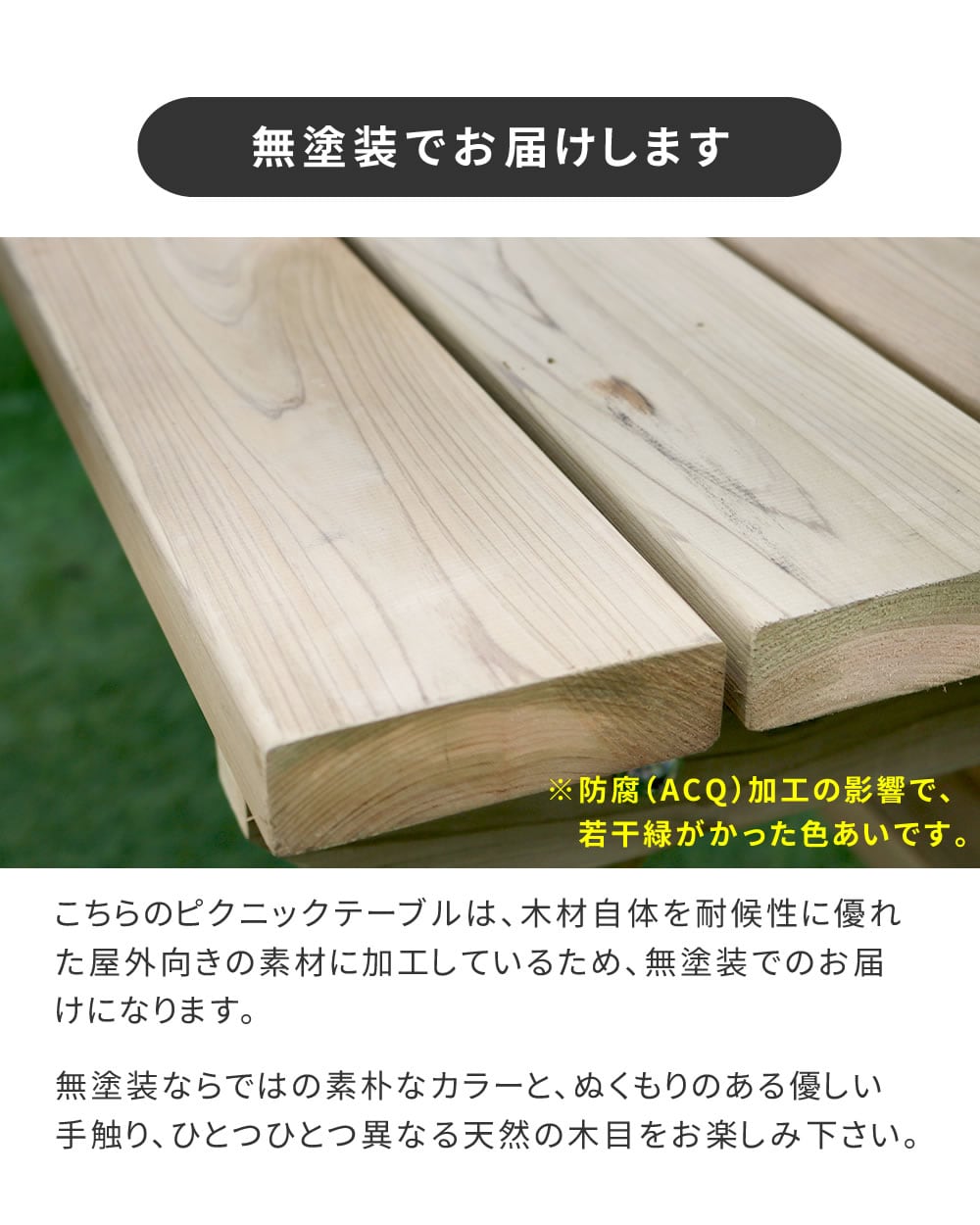 ※こちらは国産のひのき材に、防腐・防蟻(ACQ)加工を施したピクニックテーブルになります。塗装は施しておりません。