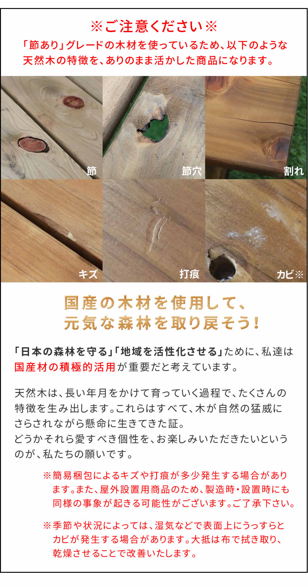 ※「節あり」グレードの木材を使っているため、節や節穴、割れ、キズのような天然木の特徴を、ありのまま活かした商品になります。