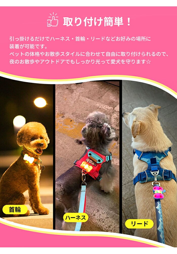 ・高い視認性:夜間や早朝の散歩、車や自転車からの視線もしっかりキャッチ