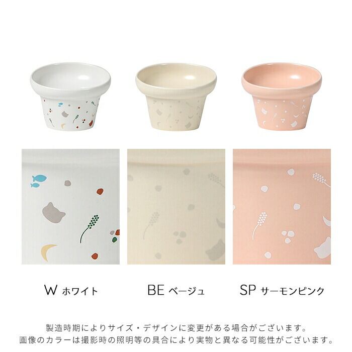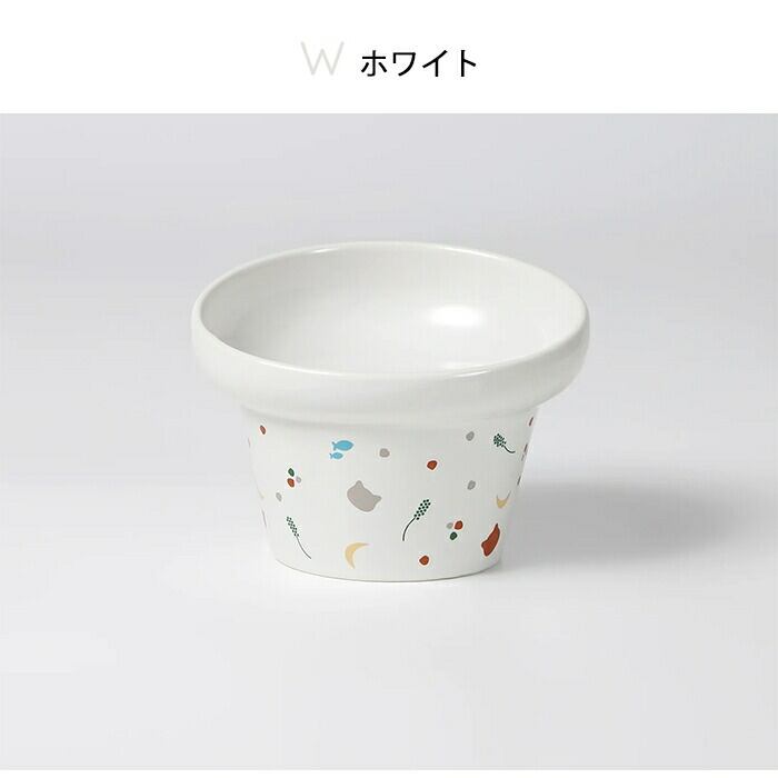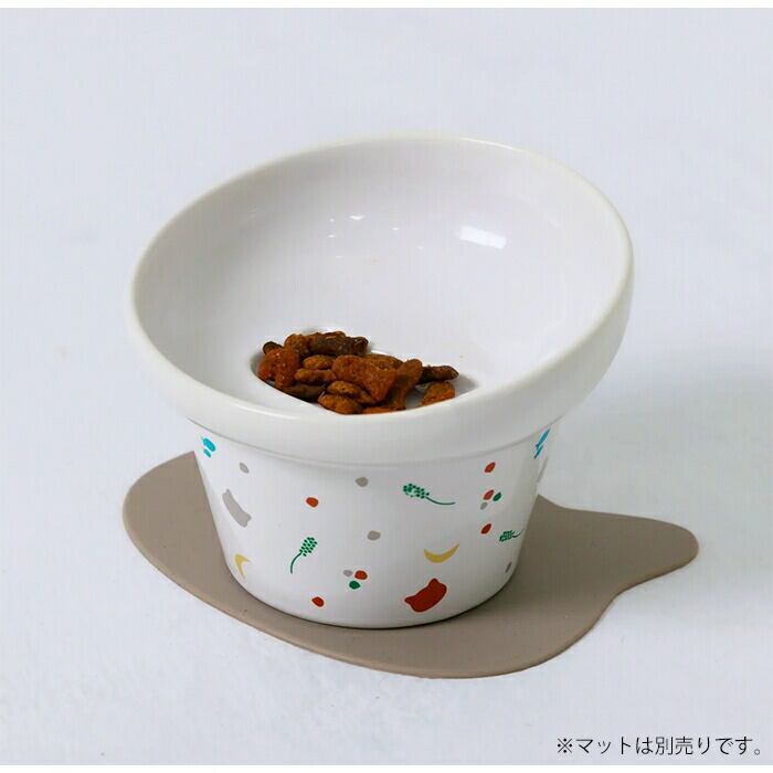 猫じゃらしや魚など、猫が大好きなモチーフをちりばめたプリント柄が、食事タイムを楽しく演出します。