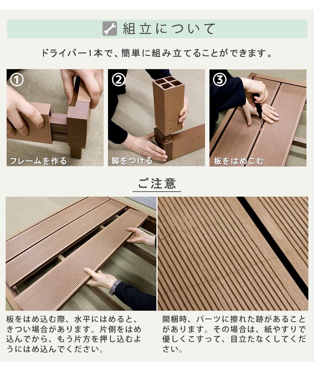 ※人工木は高い強度がありますが、鋭利なものなどで強い衝撃を与えると、割れやへこみが生じることがありますのでご注意ください。