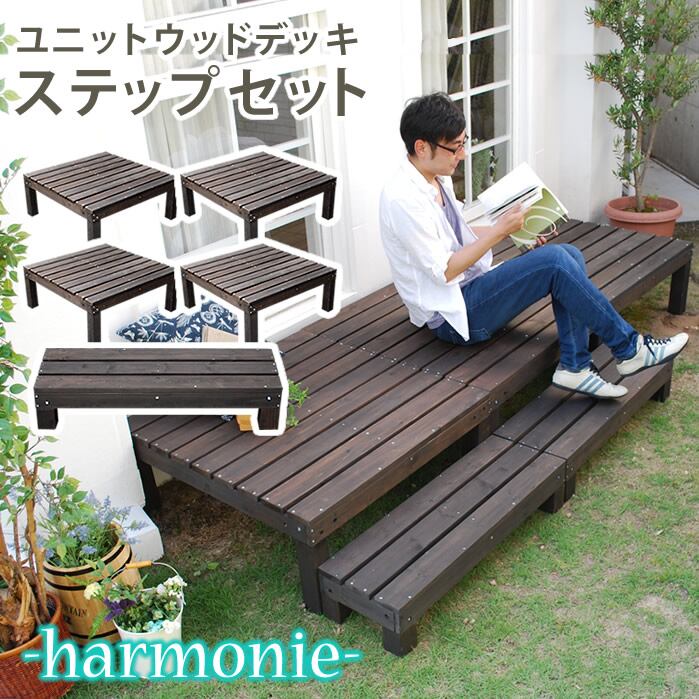 住まいスタイル ユニットウッドデッキ harmonie(アルモニー)90×90 4個組 ステップ付【送料無料 ウッドデッキ 簡単 縁側 本格的 DIY 木製 天然木 庭 ベランダ おしゃれ 小型 北欧 ガーデン 屋外 家具 ダークブラウン】