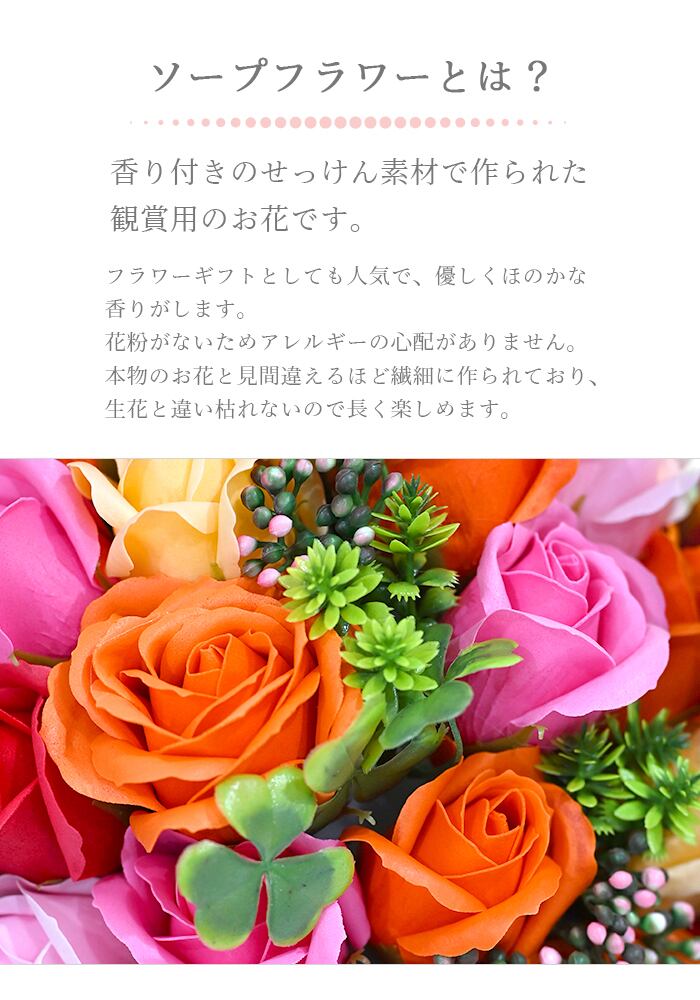 石鹸素材で作られているため、水やり不要で美しさが長く続くのも魅力。