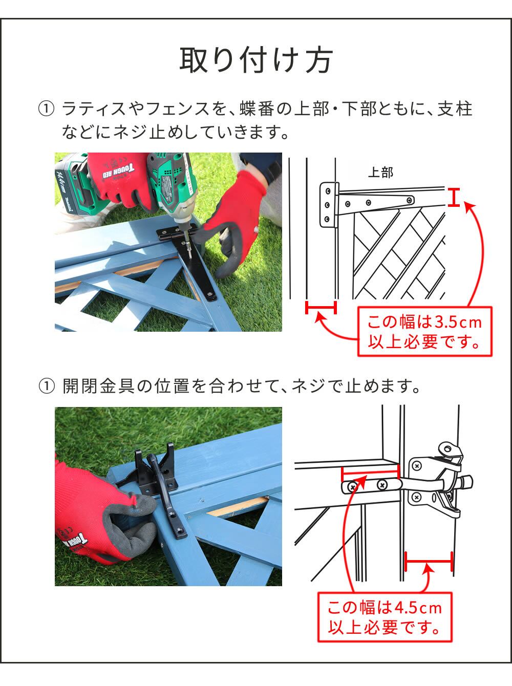 ラティスやフェンスを、開閉金具がついた片開きのゲート扉として使用できます。
