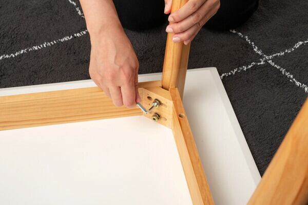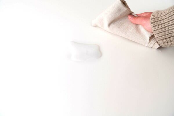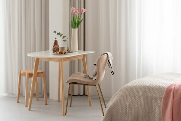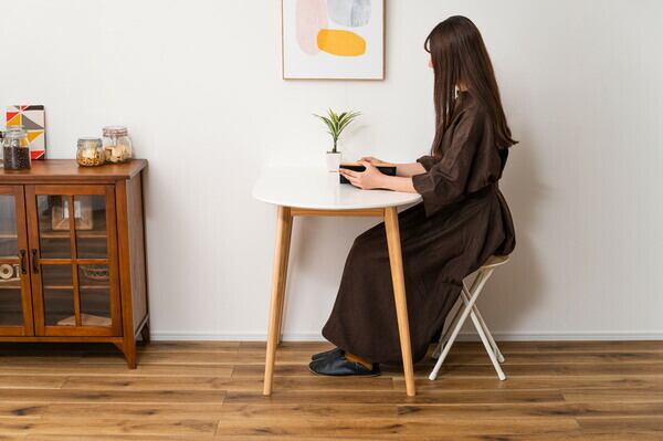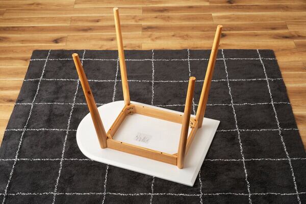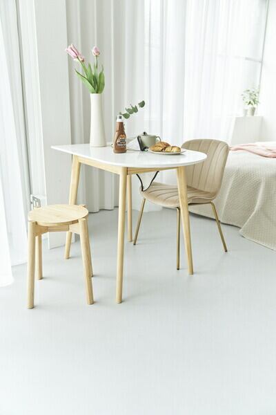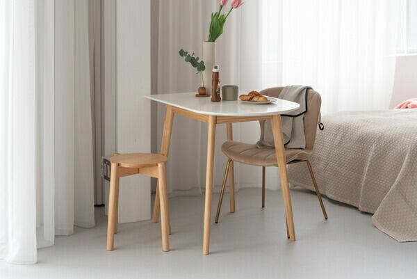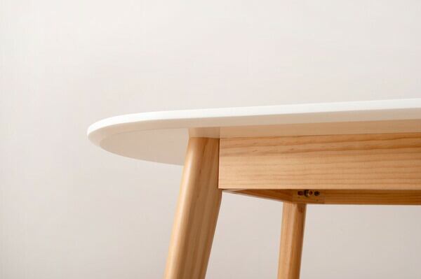 一辺に曲線を取り入れたやさしいフォルムで、凹凸のない滑らかなホワイト天板と、天然木の脚の組み合わせが可愛らしさを演出してくれます。