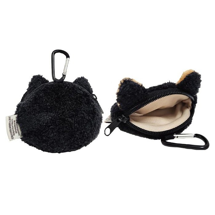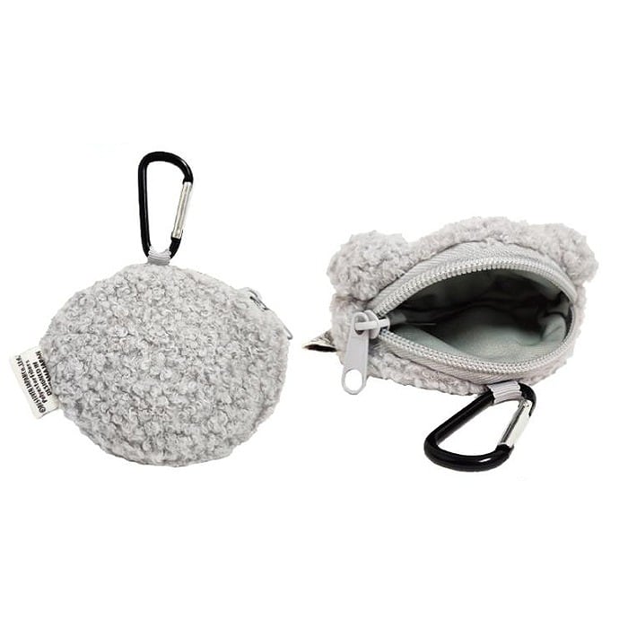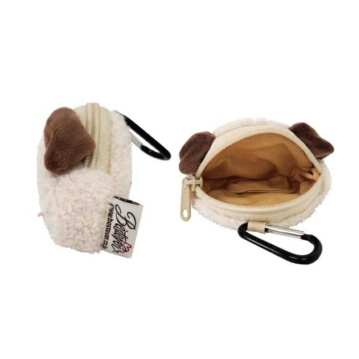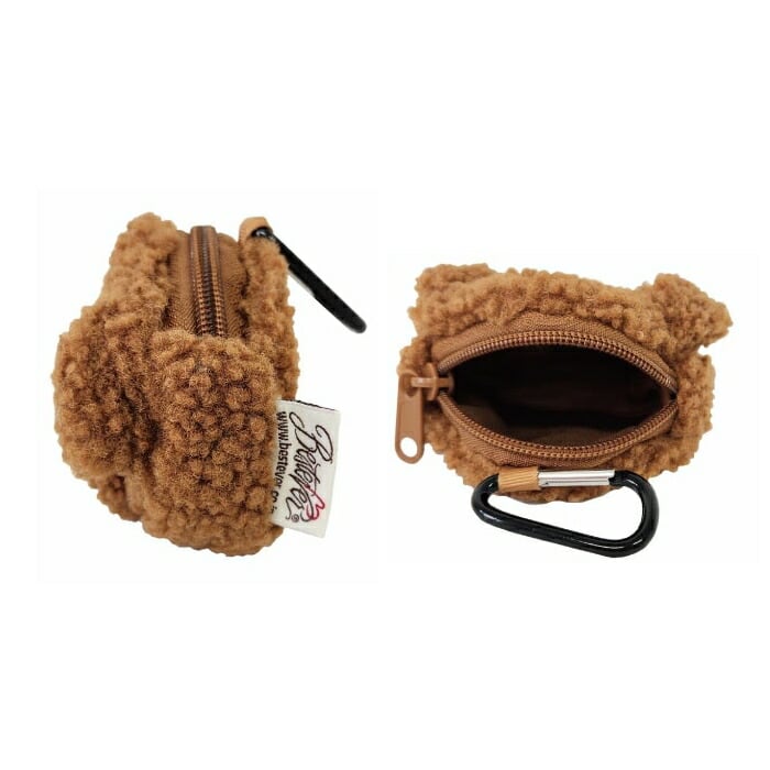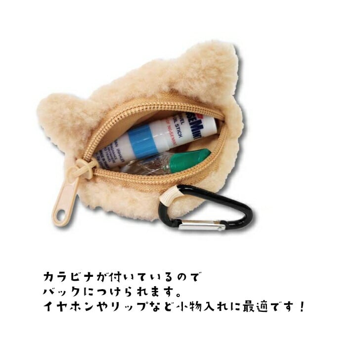 フワフワ生地の犬の顔の形をしたミニポーチです。