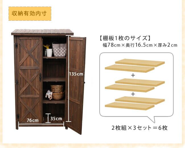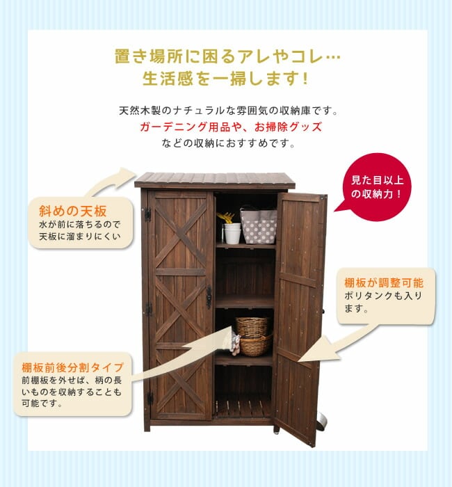 置き場所に困るアレやコレ…。生活感を一掃します!天然木製のナチュラルな雰囲気の収納庫です。ガーデニング用品や、お掃除グッズなどの収納におすすめです。棚板前後分割タイプなので、前棚板を外せば、柄の長いものを収納することも可能です。ポリタンクも入るゆとりの奥行です。