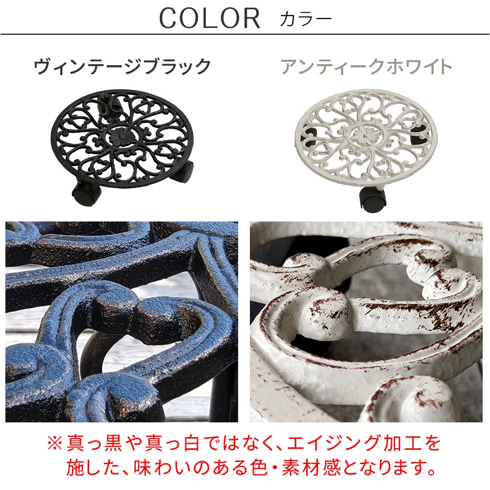 アイアン鋳物ならではのずっしりとした重みで安定感があり、大変しっかりした作りで実用的です。さらに、キャスター付きなのでお掃除も簡単です。