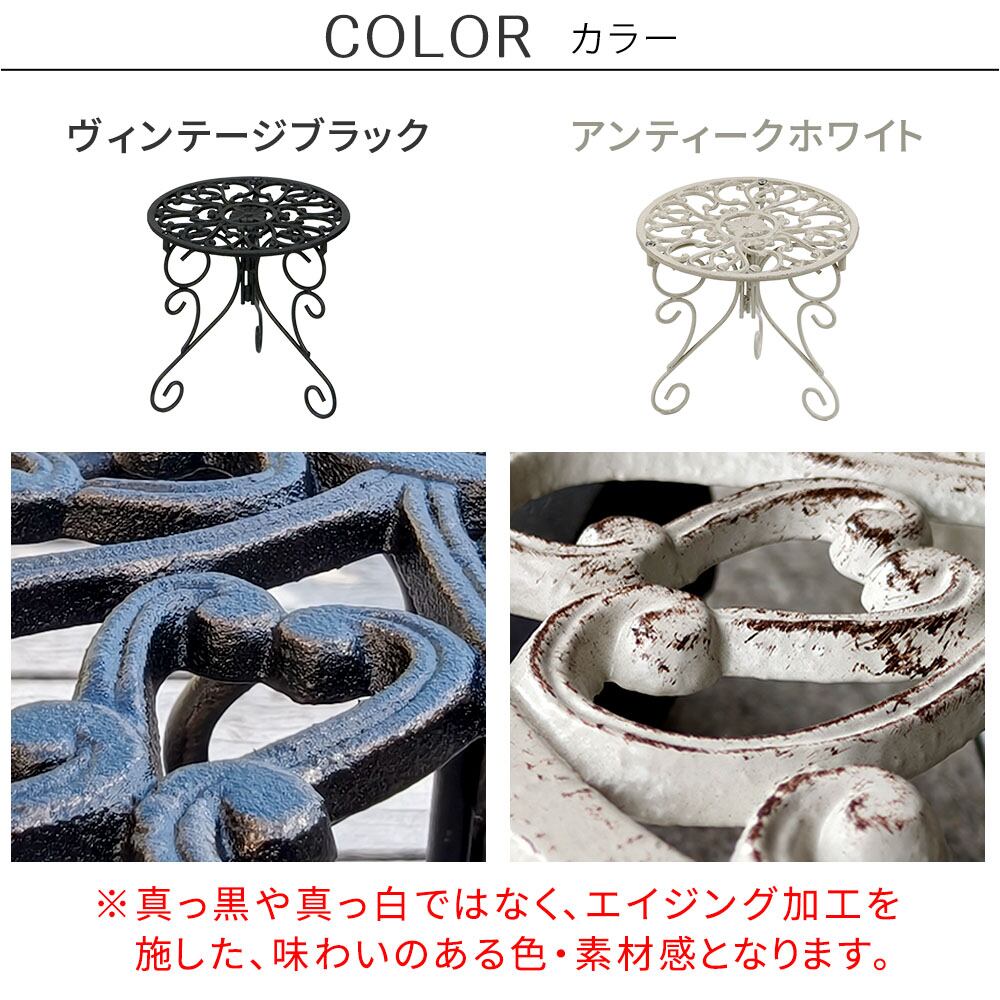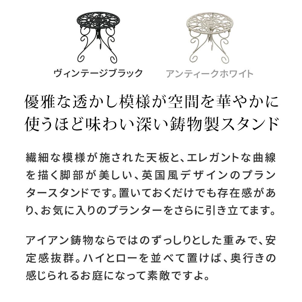 繊細な模様が施された天板と、エレガントな曲線を描く脚部が美しい、英国風デザインのプランタースタンドです。置いておくだけでも存在感があり、お気に入りのプランターをさらに引き立てます。