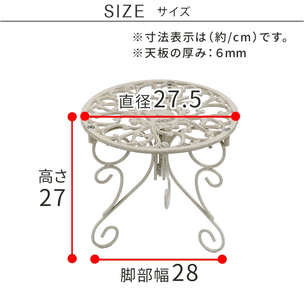 繊細な模様が施された天板と、エレガントな曲線を描く脚部が美しい、英国風デザインのプランタースタンドです。置いておくだけでも存在感があり、お気に入りのプランターをさらに引き立てます。