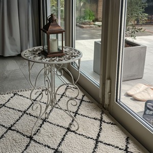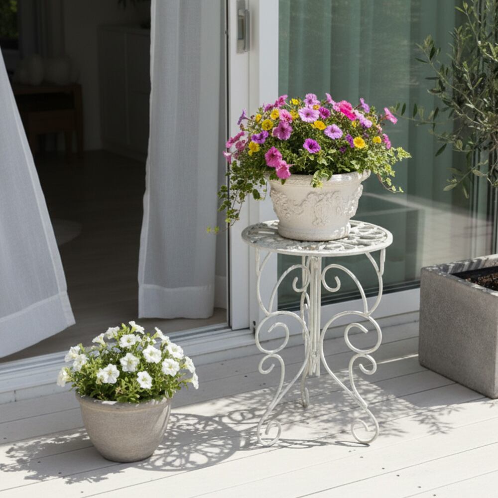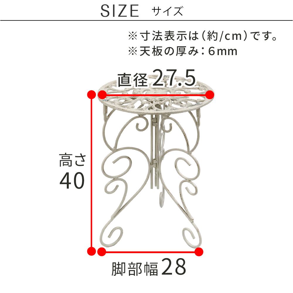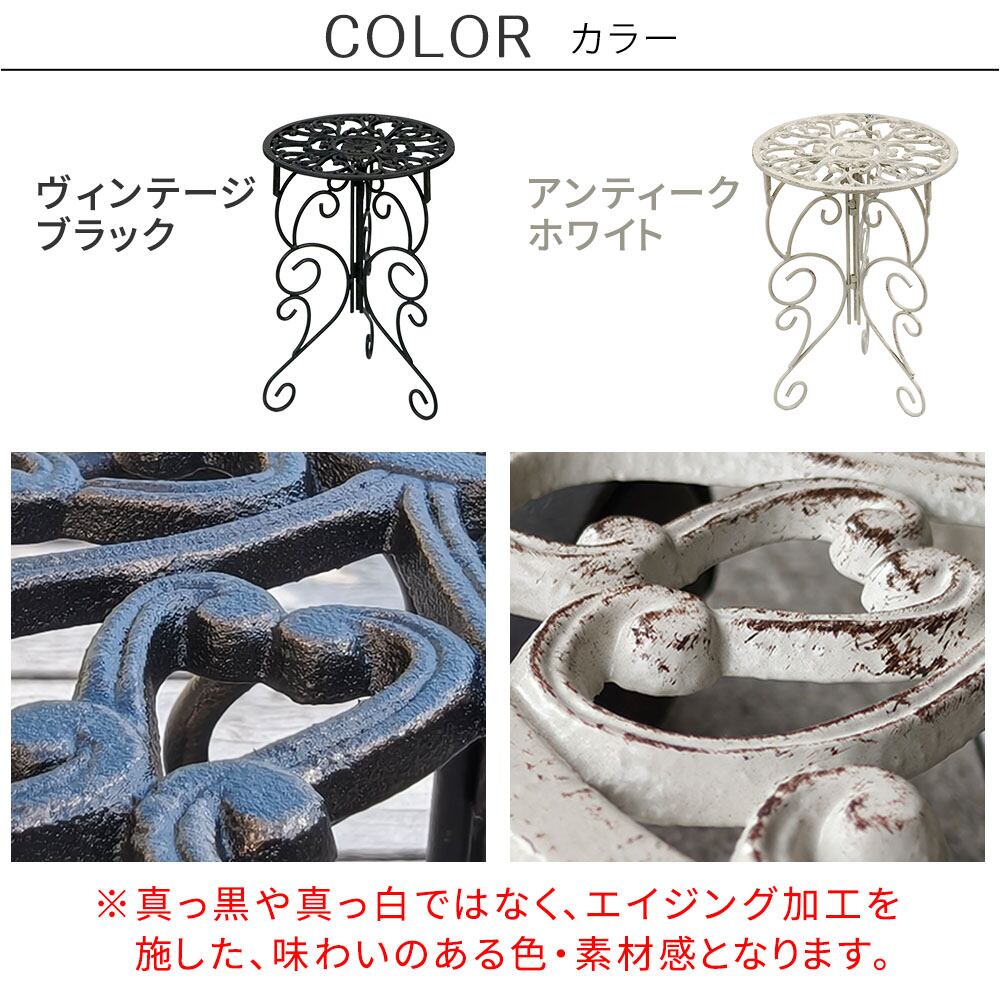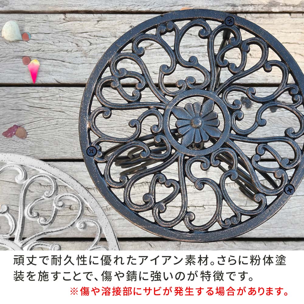 繊細な模様が施された天板と、エレガントな曲線を描く脚部が美しい、英国風デザインのプランタースタンドです。置いておくだけでも存在感があり、お気に入りのプランターをさらに引き立てます。