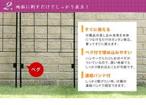 【クラシックフェンス ロータイプ(2枚組)】■清らかでクラシカルなフェンスが植物をやさしく引き立てます■美しい曲線が庭園にやわらかさを与える、シンプルなデザインのフェンスです。主役の花を美しく見せる、上品な存在感が魅力です。どんなグリーンも引き立てますが、薔薇との相性はピカイチです!センスが良く圧迫感のないフェンスは、どんな場所にもマッチして、使いやすさ抜群。高さ150cmのロータイプは、隣家との境界線に使うと、視線を遮りすぎることなく毎朝のご挨拶もできます。道路からのちょっとした目隠し&防犯にも役立ちます。 ■商品名/型番クラシックフェンス120(2枚組)…YBIF-120-2P ■カラー ブラック ■サイズ 本体:幅 約500×奥行 約13×高さ 約1510mm(1枚) ※地中埋め込み部分:約200mm ■重量 約1.6kg(1枚) ■材質 スチール(粉体塗装) ■付属品 【結束バンド】2枚組…2本 【埋め込み金具】2枚組…4本 ■組立区分 簡易組立 ■組立目安時間 2人で20分 ■生産国 中国 ■備考 ・結束バンドで左右を繋げることができます。 ・基本的に埋め込み部分をしっかり埋め込んで頂ければ自立しますが、柔らかすぎる地面などでは倒れる恐れがありますので、お客様自身で固定いただくか、ご使用をお避けください。 ※北海道・沖縄・離島は別途送料が必要となります。 アイアンフェンスシリーズ一覧 ■アイアンフェンスロー150 2枚組 DNF150-2P ■アイアンローズフェンス150 2枚組 IFROSE-150-2P ■アイアンフェンス120(2枚組) YBIF-120-2P ■アイアンフェンスロー150 4枚組 DNF150-4P ■アイアンローズフェンス150 4枚組 IFROSE-150-4P ■アイアンフェンス120(4枚組) YBIF-120-4P ■アイアンフェンスロー220 2枚組 DNF220-2P ■アイアンローズフェンス220 2枚組 IFROSE-220-2P ■アイアンフェンス220(2枚組) YBIF-220-2P ■アイアンフェンスロー220 4枚組 DNF220-4P ■アイアンローズフェンス220 4枚組 IFROSE-220-4P ■アイアンフェンス220(4枚組) YBIF-220-4P