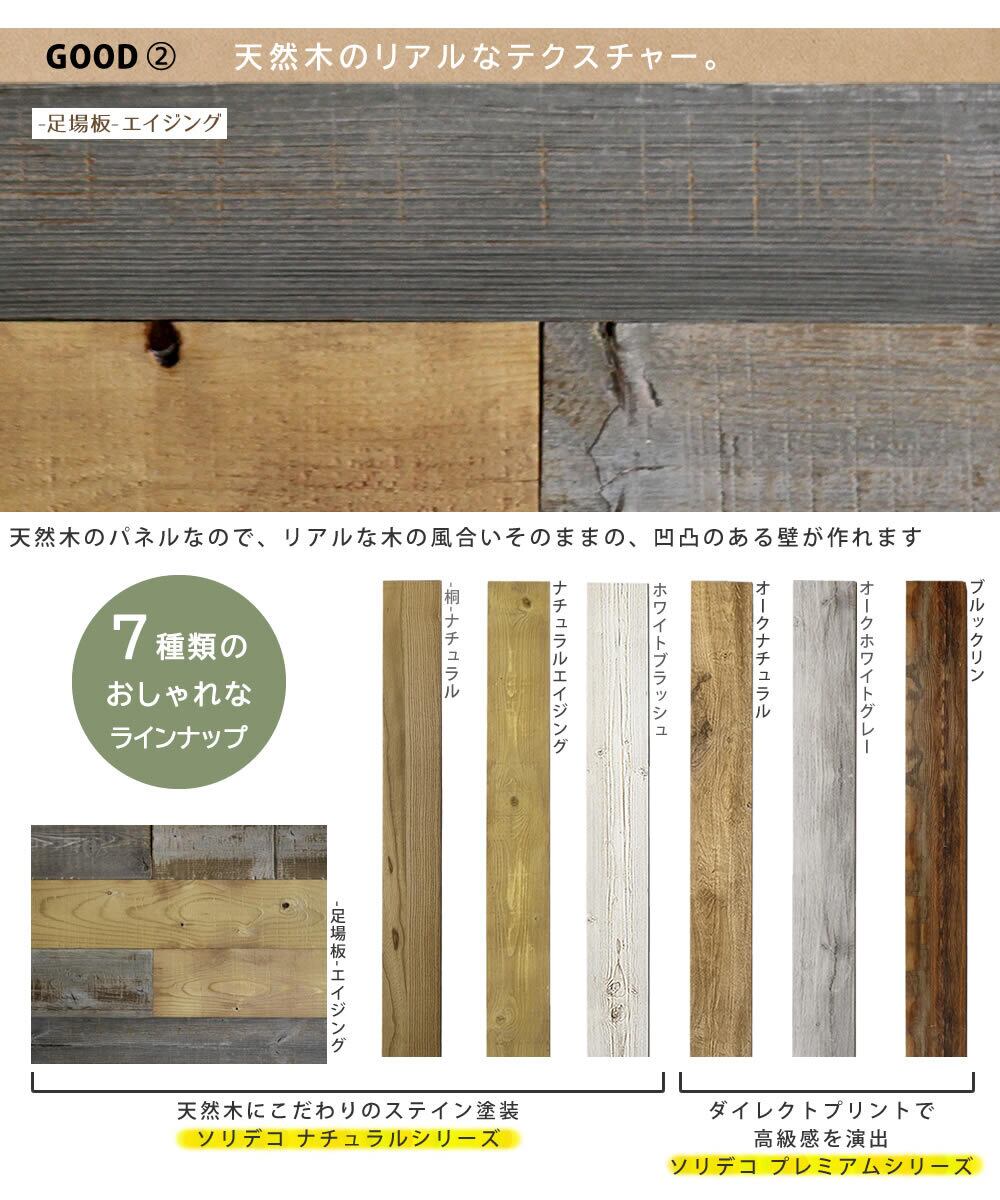 シールタイプの天然木パネル「ソリデコ」シールをはがしてペタッと貼るだけで、殺風景な壁がカフェ風に!本物の木を使用しているので、リアルでおしゃれな質感です。賃貸でも、SNS映えする憧れの壁が、簡単にお安く手に入りますよ。・両面テープでカンタン接着・天然木の上質感&雰囲気抜群・豊富なカラーバリエーション ■商品名SOLIDECO 壁に貼れる天然木パネル 40枚組(約6m2) ■品番 SLDC-40P-004ASB ■カラー ナチュラルシリーズ(-足場板-エイジング) ■サイズ(約) 本体:幅 1180×奥行 4×高さ 128mm(1枚) ■重量(約) 300g(1枚) ■材質 天然木(パイン) ■仕上げ ステイン塗装(クリア)・浮造り+ノコ目 ■組立区分 完成品 ※北海道・沖縄・離島は別途送料が必要となります。 ソリデコ ナチュラルシリーズ(ステイン塗装) 10枚セット 20枚セット 40枚セット -桐-ナチュラル SLDC-10P-001KRI SLDC-10P-001KRI SLDC-10P-001KRI ナチュラルエイジング SLDC-10P-002AGE SLDC-10P-002AGE SLDC-10P-002AGE ホワイトブッシュ sldc-10p-003wht sldc-10p-003wht sldc-10p-003wht -足場板-エイジング sldc-10p-004asb sldc-10p-004asb sldc-10p-004asb ソリデコ プレミアムシリーズ(ダイレクトプリント) 10枚セット 20枚セット 40枚セット オークナチュラル SLDCPR-10P SLDCPR-20P SLDCPR-40P オークホワイトグレー ブルックリン