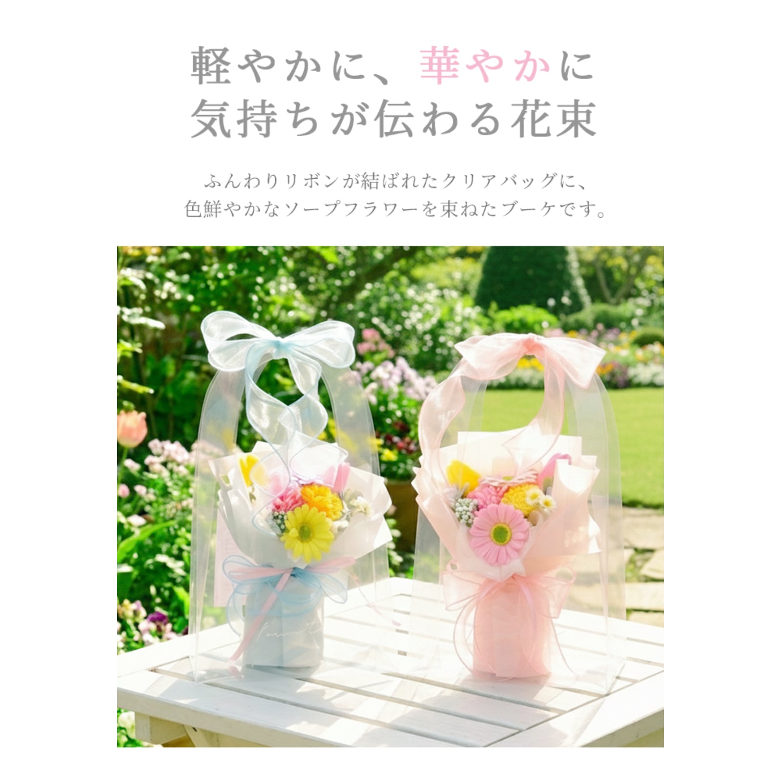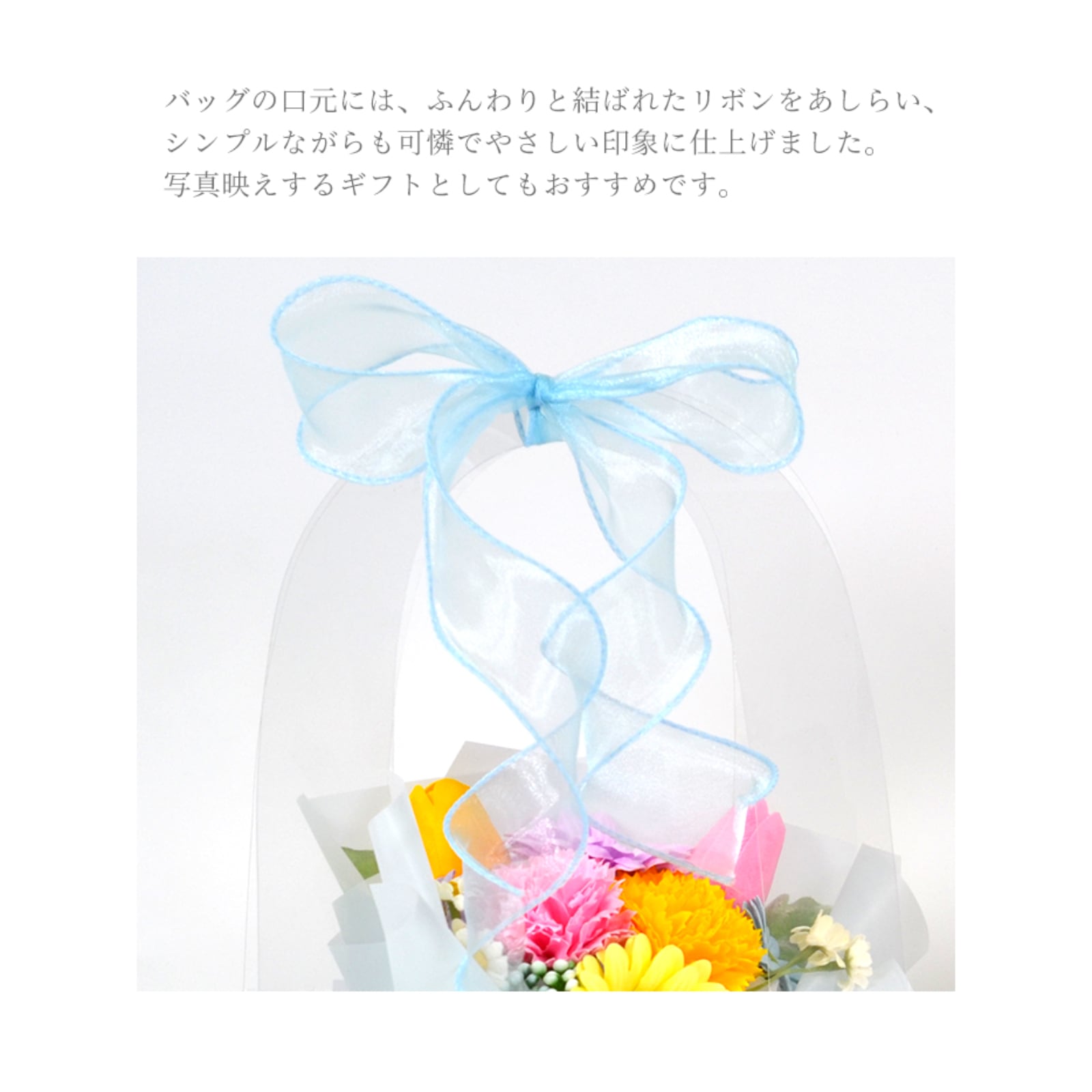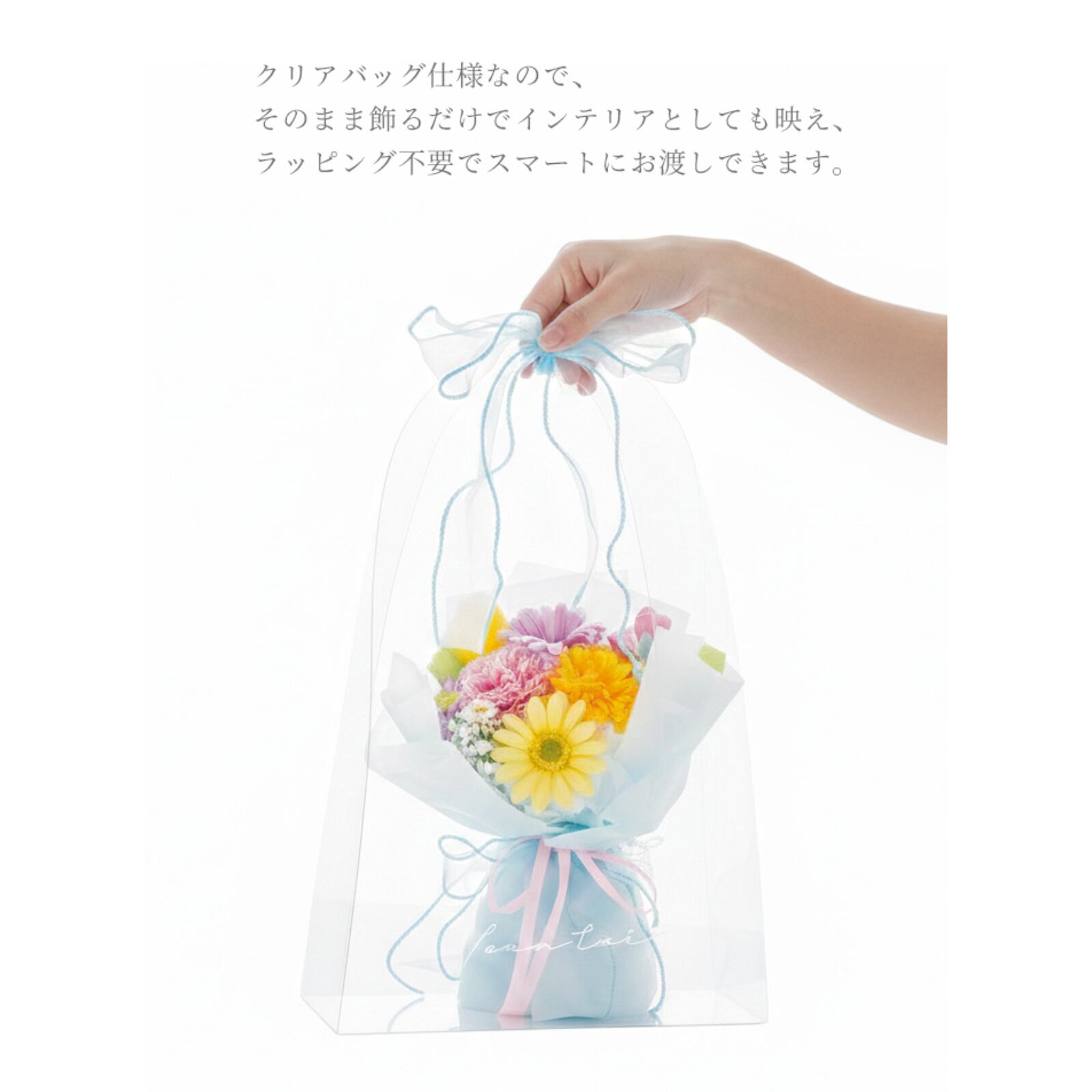 クリアバッグ入りソープフラワーブーケです。