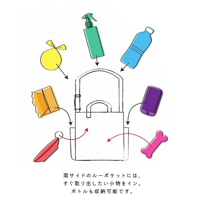 両サイドのルーポケットには、すぐ取り出したい小物をイン。ボトルも収納可能です。