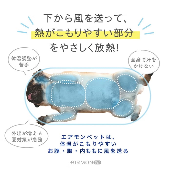 「エアモンペット」は、送風ファン内蔵&冷感素材の“風が出るクールマット”です。