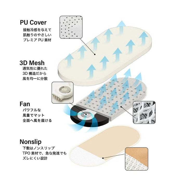 3Dメッシュ構造でマット全体に風を送り出し、こもりがちな熱気をやさしく逃がします。