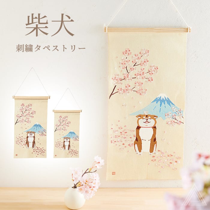 柴犬 刺繍タペストリー 壁掛け Sサイズ 桜富士柴犬 富士山 春 桜 和柄 インテリア 木製バー・紐付き 柴犬グッズ 犬グッズ プレゼント 贈り物 四季 柴犬好き しばいぬ コンパクト おしゃれ 可愛い 犬好き 癒し 送料無料 5211 5211-A 5211-B